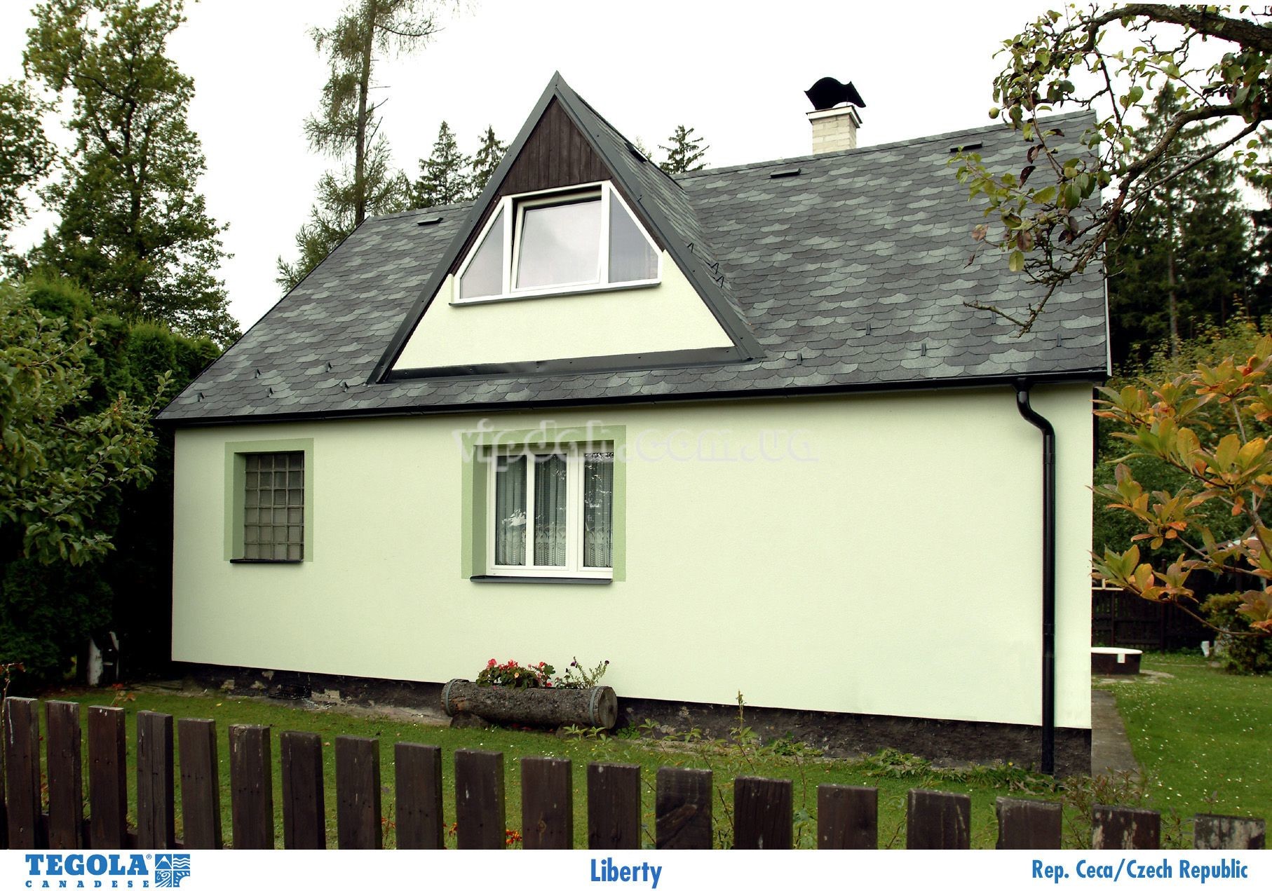М'яка черепиця колекції Tegola Преміум Liberty (Ліберті) має автентичний західноєвропейський вид. Досконалість форми надає простір для створення витонченого дизайну як в сучасному, так і в старовинному стилі. Унікальна нарізка гонту дає простір фантазії. Масив черепиці складається з половинок восьмиугольников, накладених один на одного. Таким чином утворюється щільна двошарова поверхню, що витримує великі довготривалі навантаження зовнішнього агресивного середовища. Малюнок асоціюється з вигадливо обробленими дерев'яними, глиняними або кам'яними пластинами. Це залежить від кольору моделі Ліберті, назва яких задає напрям думки: Соснова кора, Червоний Іспанія, Темний сланець, Червоний Європа і Зелений камінь. Тонові переходи надають обсягу черепиці та роблять природну схожість ще очевидніше.