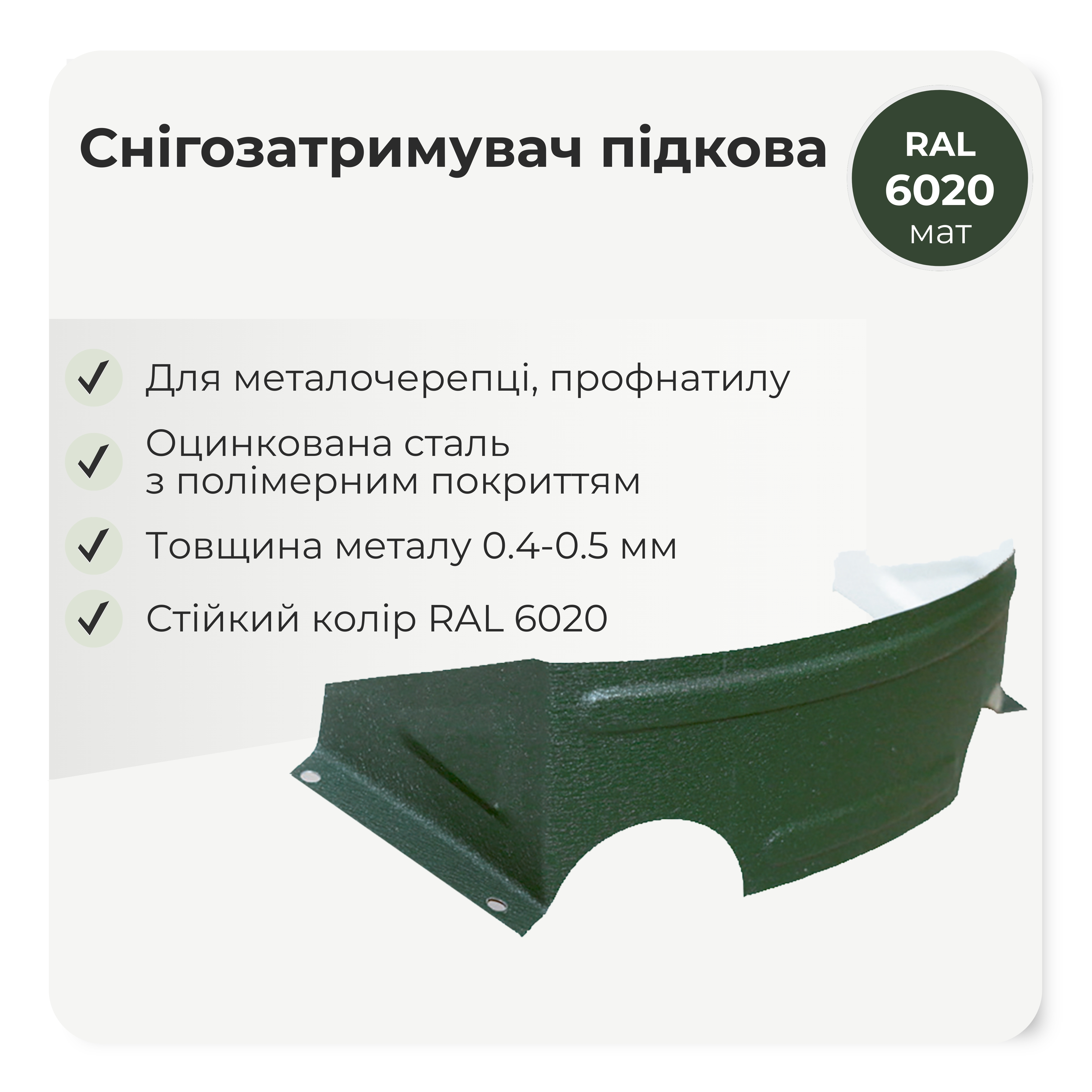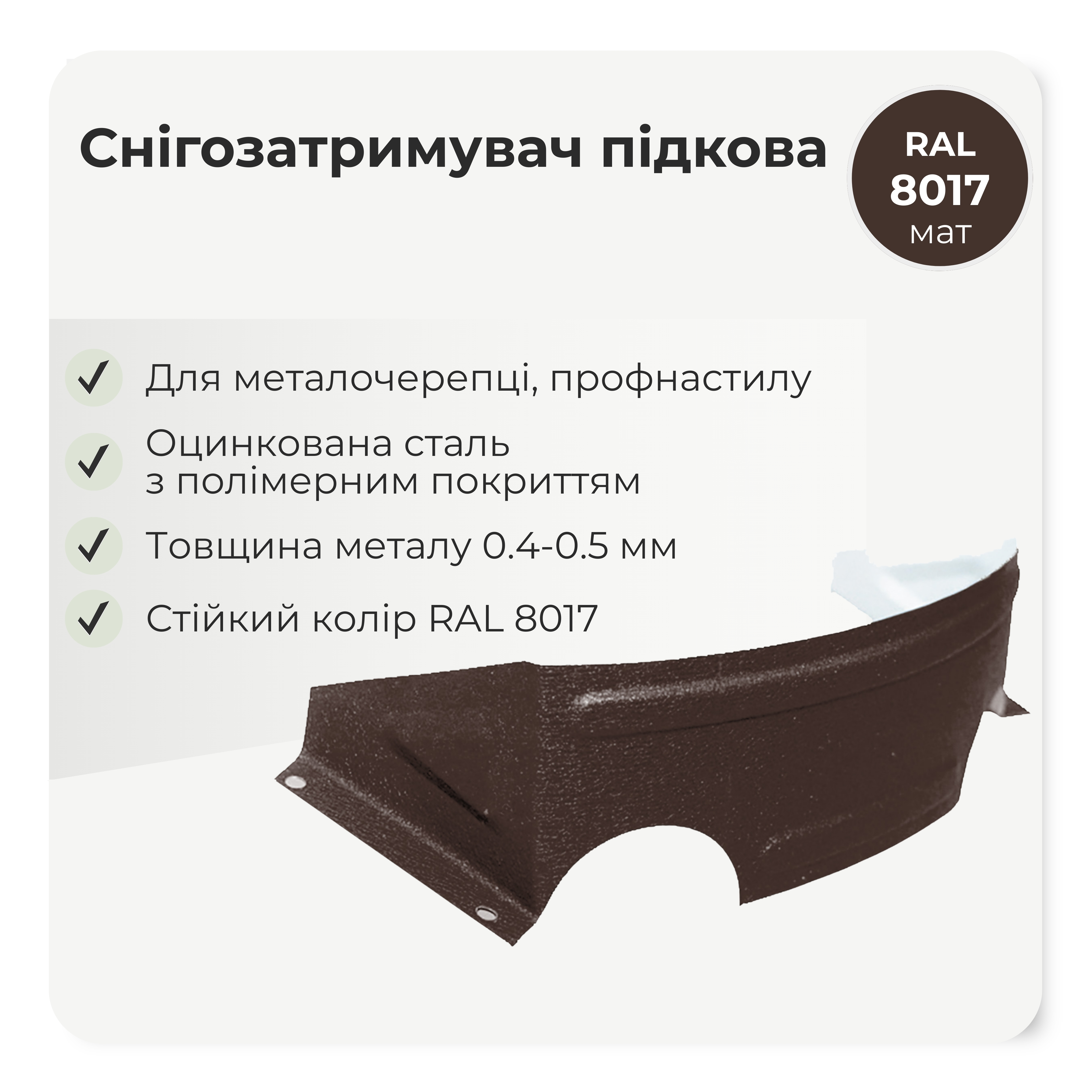 Снігозатримувач польський або, як ще його називають, снігоріз "підкова", в залежності від способу монтажу, затримує сніг на покрівлі або розрізає його на частини, зменшуючи навантаження на покрівельне покриття. При установці з розривами дозволяє снігу частково сходити з покрівлі. Встановлюється на будь-яку форму металочерепиці по карнизному звісу в шаховому порядку, над мансардними вікнами і вентиляційними виходами, а також уздовж розжолобків. Виготовляється з оцинкованого металу з полімерним покриттям, глянцевого або матового, і товщиною 0,5 мм і має широку кольорову гаму. Для кріплення снігорізів застосовують покрівельні саморізи з ущільнювальною гумкою 4,8х35мм. Можливо застосовувати снігоріз на покрівлях з профнастилу.
