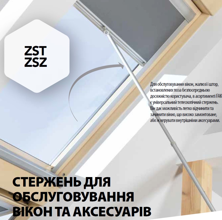 Універсальний телескопічний стержень ZST допомагає легко відчиняти високо замонтовані вікна. Можна використовувати також для штор ARS, ARP, ARF, жалюзі AJP та москітної сітки AMS, які замонтовані поза зоною досяжності користувача. Довжина стержня становить 119 см і має можливість регулюватися до довжини 134, 162, 190 i 218 см. Завдяки використанню додаткового видовження ZSP можна отримати наступні довжини стержня: 246, 274, 302 i 330 см.