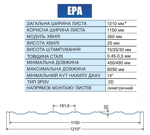 Геометрія металочерепиці "Ера" представлена на малюнку: