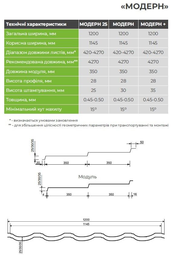 Геометрія металочерепиці "Модерн" представлена на малюнку:
