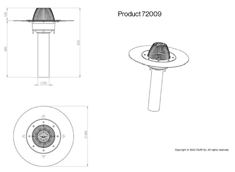 Монтаж: АМ водостічна вирва монтується на покрівлі між двома шарами гідроізоляції, фланець вирви кріпиться до гідроізоляції з двох сторін рідким бітумом. Вирва додатково кріпиться до основи покрівлі шурупами або кріпленнями для теплоізоляції через отвори в нижньому фланці поліпропілену, розташованого під фланцем з покрівельного матеріалу.