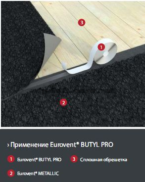 Двостороння бутилова стрічка Eurovent® BUTYL PRO використовується в першу чергу як стрічка ущільнювача під контррейки, що забезпечує щільну поверхню в місцях встановлення контррейок на покрівельній мембрані. Забезпечує герметичність там, де цвяхи та скоби протикають мембрану. Крім того, він використовується для з'єднання та герметизації пароізоляценних плівок та покрівельних мембран, чудово поєднується з пластмасою, бетоном, деревом, цеглою або металевими елементами. Він також ідеально підходить для каркасного будівництва для склеювання та герметизації вітрозахисних мембран.