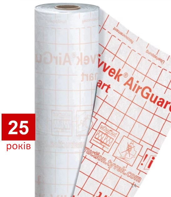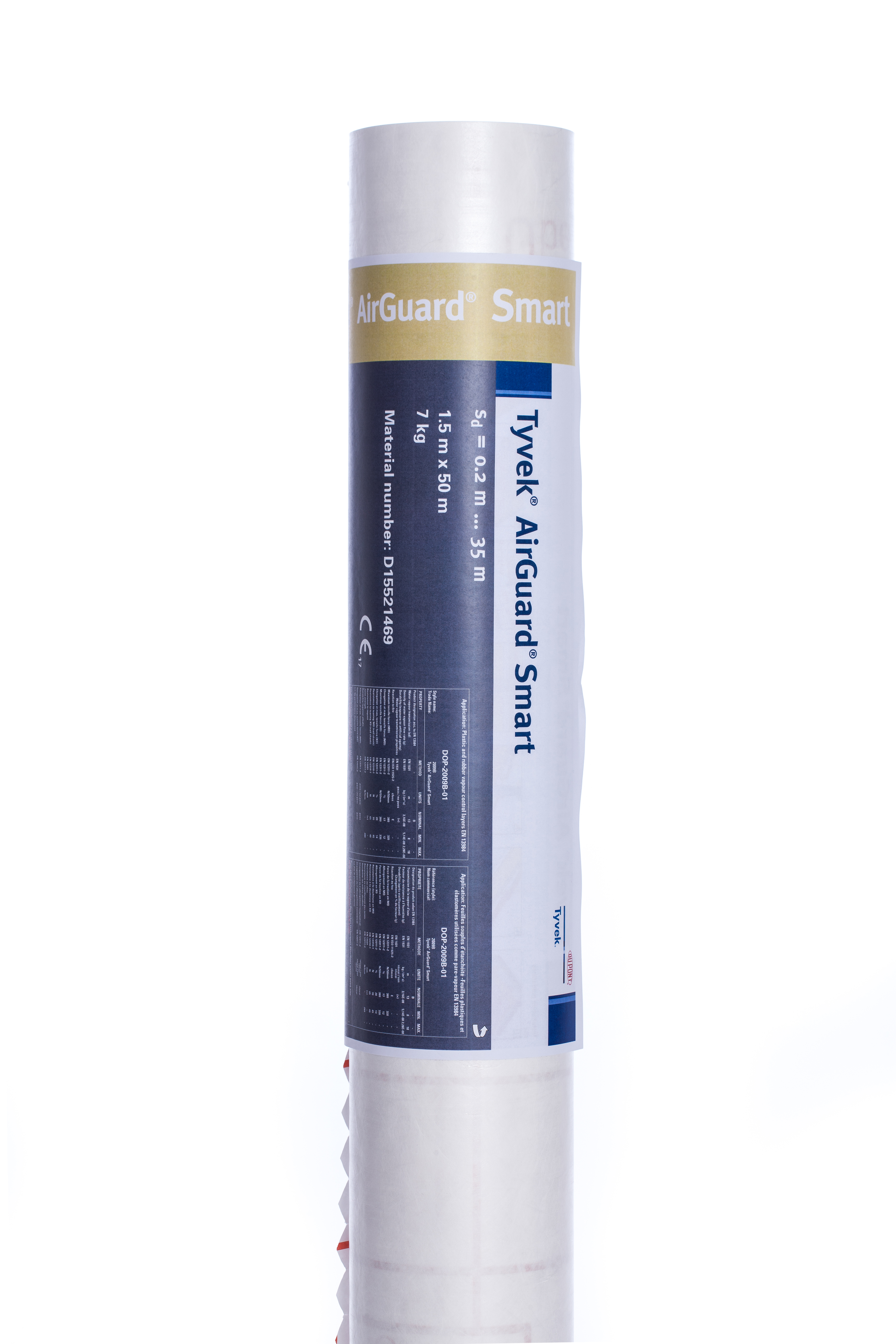 Tyvek AirGuard Smart - пароізоляційна мембрана зі змінним опором дифузії. У стандартних умовах паропроникність має значення Sd 25-30 метрів, тобто вона працює як ефективний пароізолятор. Але якщо у стіні виникає протікання, і волога починає випаровуватись всередину, значення Sd зменшується до 0,2 метра, і мембрана починає діяти як дифузійна, що дозволяє просушити конструкцію. Цей матеріал підходить для стандартних будівель, але не рекомендується для використання у вологих приміщеннях.