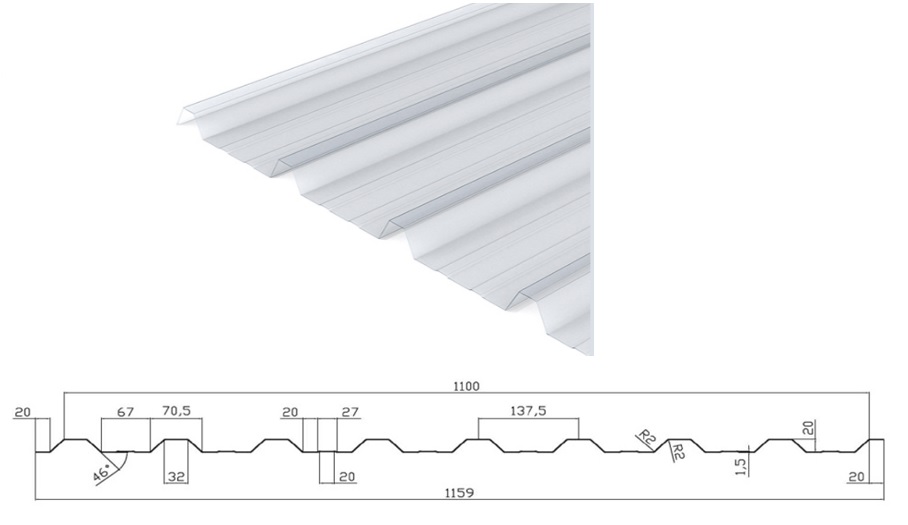 Прозорі профільні листи повністю відповідають розмірам профнастилу НС-20 Компанії "ТАЙЛ". Зазвичай ці профнастили використовуються для облаштування покрівель як верхні покрівельні листи. На своїх складах ми маємо постійний запас прозорого профільного листа НС-20.