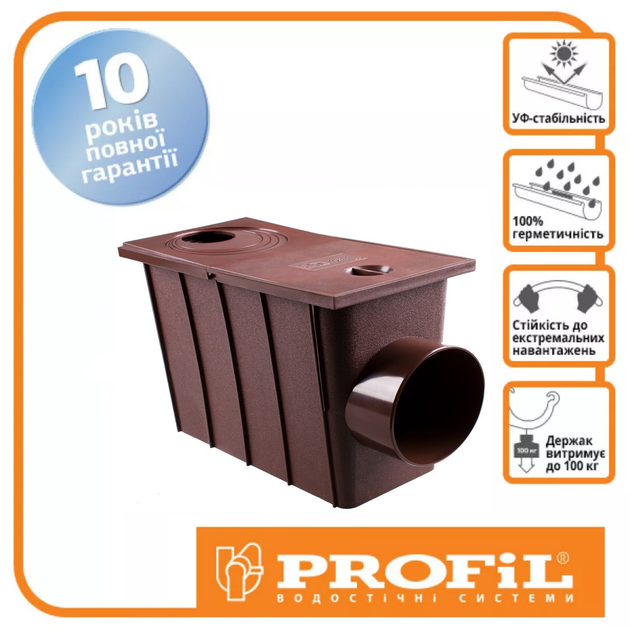 Зливний колодязь Profil (75/100) - це складова частина покрівельної водостічної системи. Застосовується для стоку дощових і талих вод в каналізацію. Даний елемент володіє еталонним якістю, високою надійністю і саме тому український споживач віддає перевагу даного варіанту серед всіх інших представлених на ринку. Гарантований виробником термін служби зливного колодязя Profil становить 25 років, що в кілька разів перевищує показники аналогів від інших виробників.