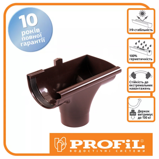 Лійка - це елемент водостічної системи, необхідний для відводу дощової і талої води з жолоба в трубу. Лійки PROFiL обладнані EPDM каучуковими ущільнювачами, які повністю виключають протікання. Також на елементі є спеціальне вушко для додаткового кріплення і більшої надійності конструкції.