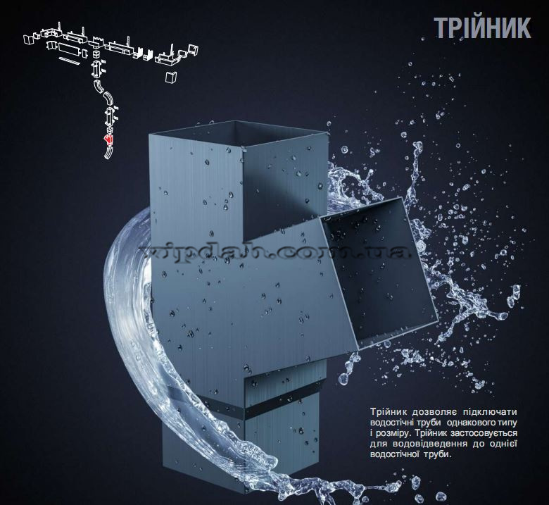 Трійник дозволяє підключати водостічні труби однакового типу та розміру. Трійник застосовується для водовідведення в одну трубу.