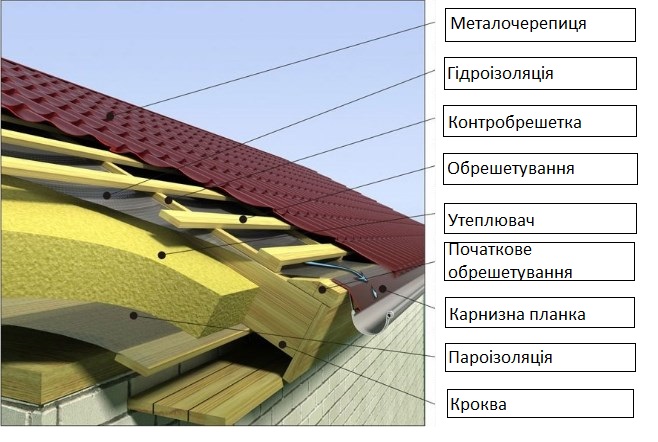 Установка даху з металочерепиці передбачає вентиляцію і фіксацію ізоляційного покриття, які забезпечують цілісність навісу, захищаючи дерев'яні елементи від гниття, а металеві - від корозії.